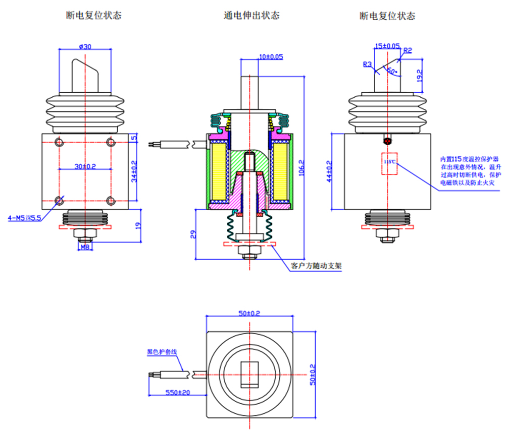由于采用高导磁的材料和带有锥形配合的磁路结构,因此产品虽然体积小、重量轻,但与常规的小型电磁铁相比,其行程和吸引力都较大,因其绕线空间利用率高,线圈部分是敞开式的,散热效果好。