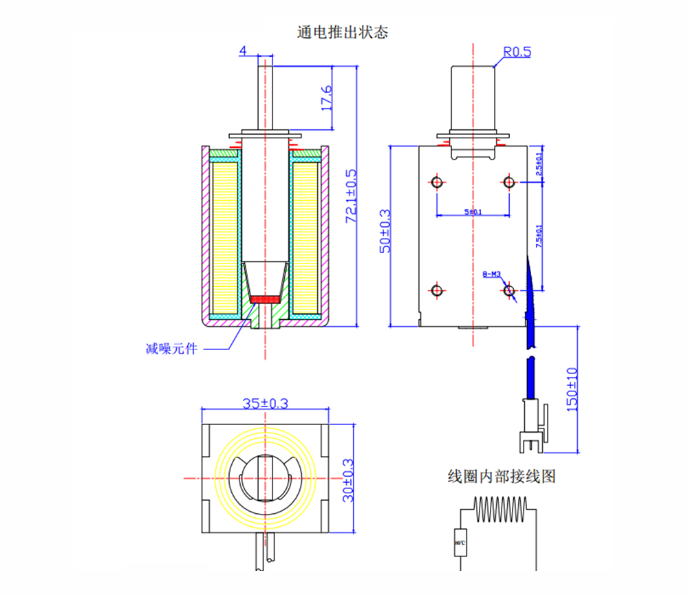 由于采用高导磁的材料和带有锥形配合的磁路结构,因此产品虽然体积小、重量轻,但与常规的小型电磁铁相比,其行程和吸引力都较大,因其绕线空间利用率高,线圈部分是敞开式的,散热效果好。