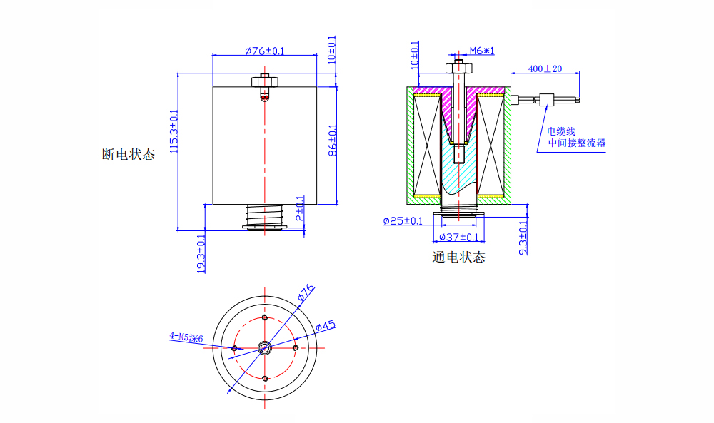 由于采用高导磁的材料和带有锥形配合的磁路结构,因此产品虽然体积小、重量轻,但与常规的小型电磁铁相比,其行程和吸引力都较大,因其绕线空间利用率高,线圈部分是敞开式的,散热效果好。